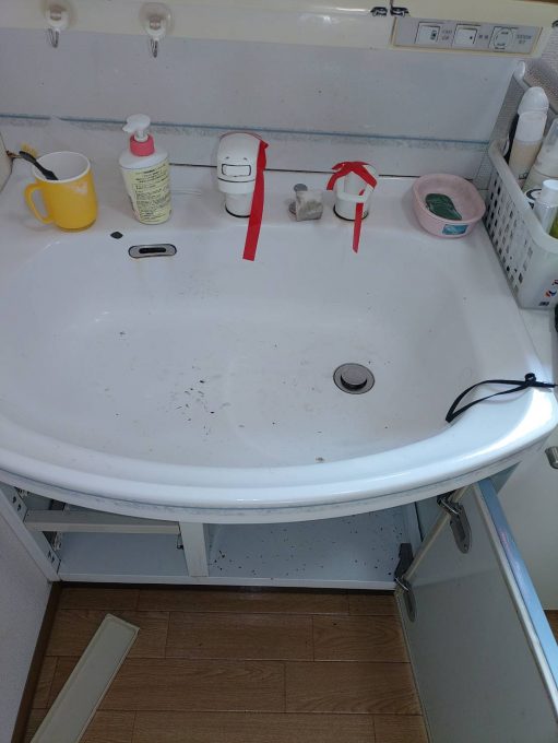 洗面蛇口の水漏れ修理依頼で訪問しました。蛇口ホースから水漏れで、20年以上お使いなので新しい蛇口に取替えさせていただきました。