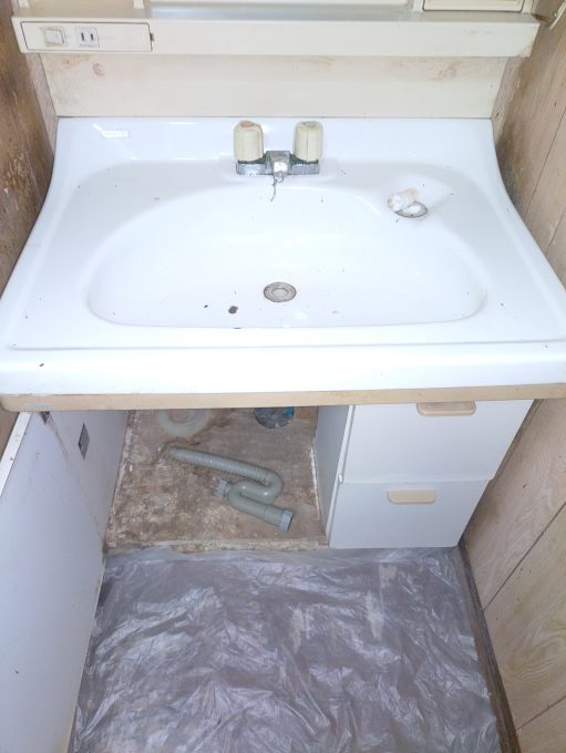 洗面蛇口の水漏れとの事で、訪問させていただきました。ツーバルブ水栓で使用年数も長いため、新しいレバー水栓に取り替えをご希望されました。