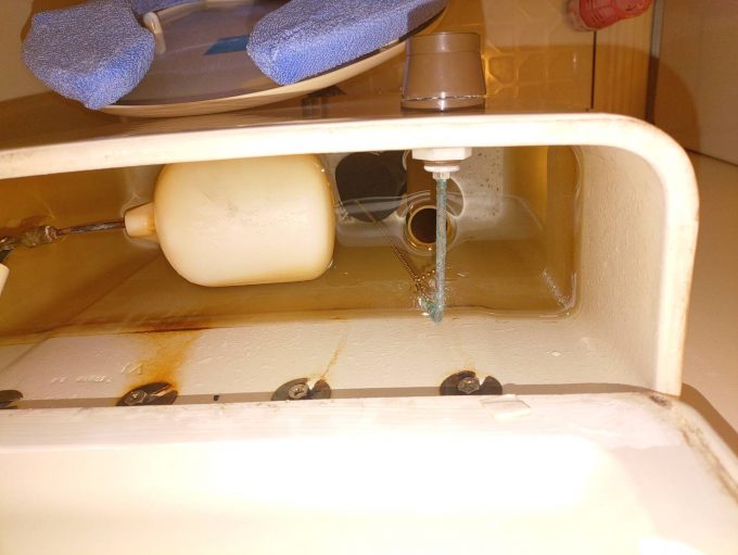 点検させていただきますと、いつまでもタンクにポタポタ水が止まらない状態です。40年お使いとの事なので、新しく金具を取替える提案をさせていただきました。