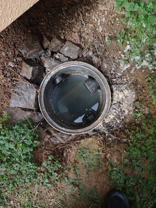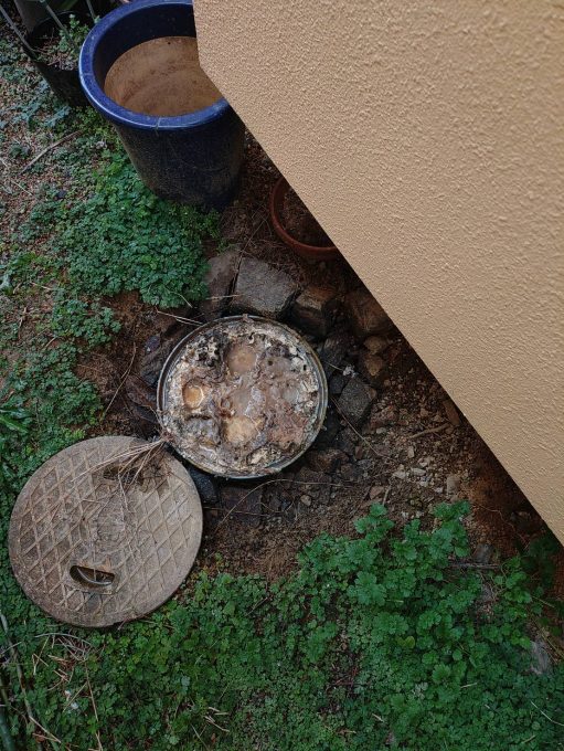 点検させていただきますと、台所の外の排水桝が排水かすと油の塊でいっぱいです。住まわれて30年掃除した事が無いとの事。桝だけでなくメインの排水管も汚れが蓄積しています。桝の清掃と家全体の排水管の高圧洗浄を提案させていただきました。